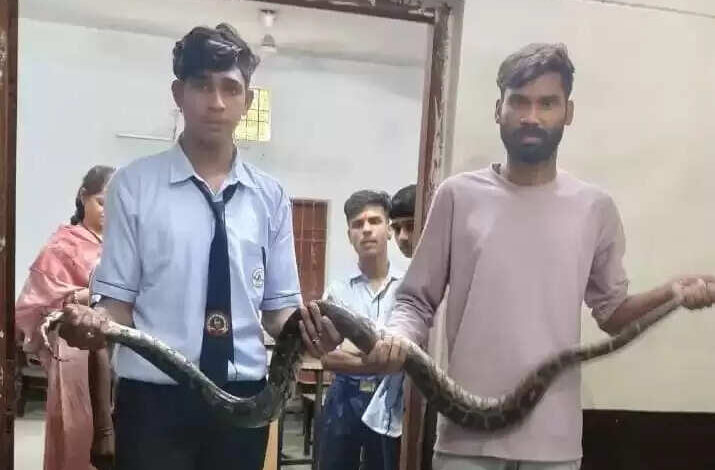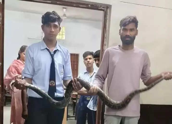 शनिवार सुबह करीब 10 बजे आत्मानंद पब्लिक स्कूल में गणित की क्लास चल रही थी। एक छात्रा के बेंच के नीचे 8 फीट का विशालकाय अजगर कुंडली मारकर बैठा था। अजगर की फुंकार सुनकर क्लास में अफरा-तफरी मच गई। शिक्षक और छात्र तुरंत क्लासरूम से बाहर निकल आए।