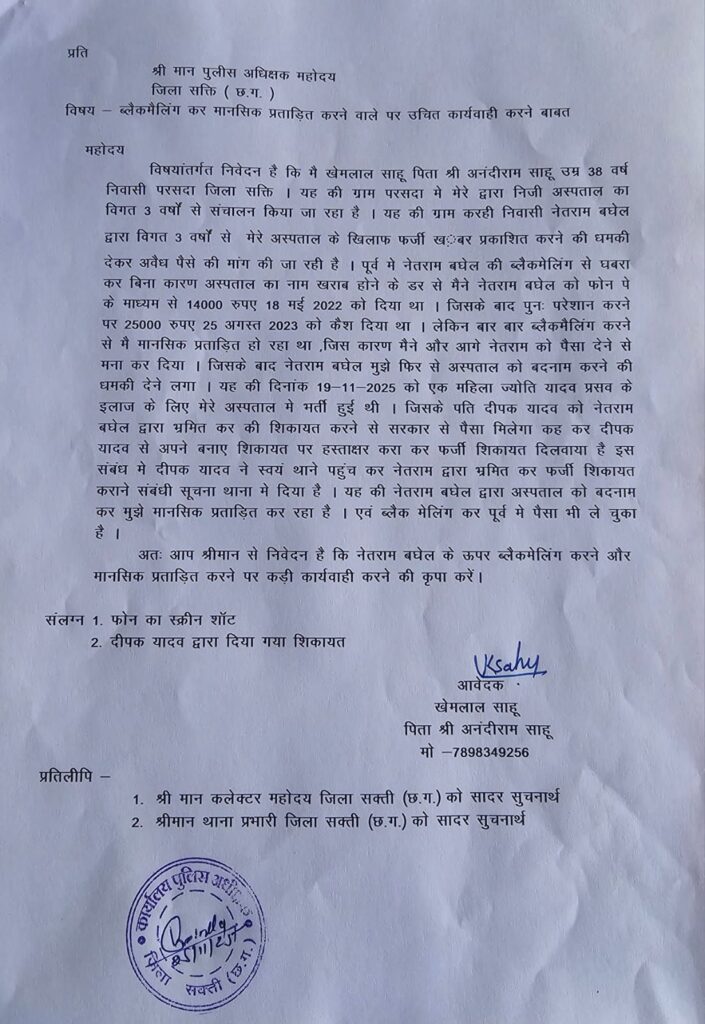 दरअसल परसदा स्थित लाइफ लाइन हॉस्पिटल विगत 3 वर्षों से संचालित हो रहा है । इस बीच अपने आप को बड़ा पत्रकार बतलाकर नेतराम बघेल अस्पताल से पैसे की मांग करता रहता था और नही देने पर अस्पताल के खिलाफ फर्जी समाचार लगाकर बदनाम करने की धमकी और ब्लैकमेलिंग करता था , बिना वजह बदनाम होने के डर से अस्पताल प्रबन्धन ने नेतराम बघेल को फोन पे के माध्यम से और कैश सहित 39 हजार रुपए दो बार मे दिए थे। लेकिन नेतराम का पेट इतने से नही भरा तो फिर पैसे की मांग करने लगा , लगातार प्रताड़ित होने पर अस्पताल संचालक ने और पैसे देने से मना किया , तो नेतराम बघेल ने समय आने पर देख लेने की धमकी और ब्लैक मेलिंग करता रहा।