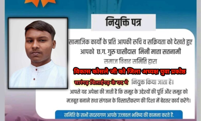 सारंगढ़-बिलाईगढ़: गुरु घासीदास मिनीमाता सतनामी समाज समिति के प्रदेश नेतृत्व द्वारा संगठन का विस्तार करते हुए श्री विकास कोसले को जिला सारंगढ़-बिलाईगढ़ के युवा प्रकोष्ठ का जिला अध्यक्ष नियुक्त किया गया है। विकास कोसले की सक्रियता और समाज के प्रति उनके समर्पण को देखते हुए प्रदेश नेतृत्व ने उन्हें यह महत्वपूर्ण जिम्मेदारी सौंपी है।