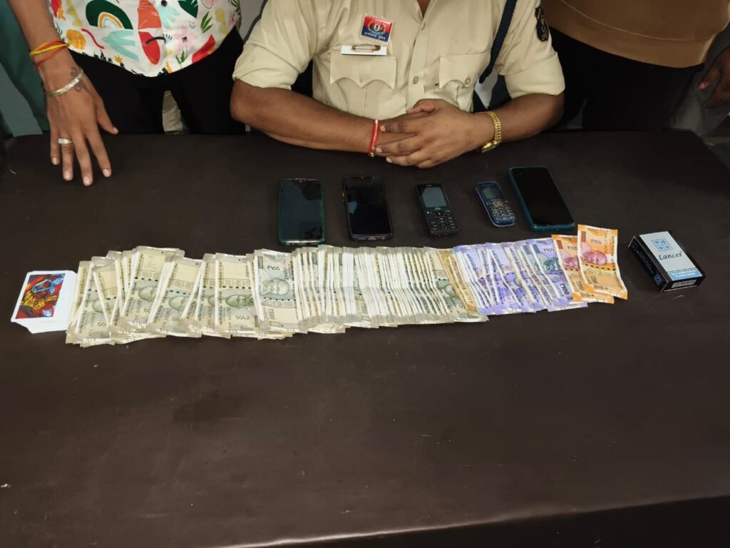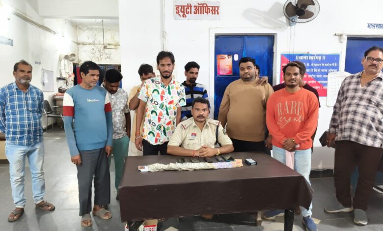 जहां पर जुआडियान- (1) शैलेश यादव पिता चंद्रीका यादव सा0 बावाकुटी सारंगढ़ (2) अलताश पिता रसीद खान निवासी डीपरापारा सारंगढ़ (3) राहूल खुटें पिता दिनानाथ खुटें निवासी चंदाई थाना सारंगढ़ (4) पिताम्बर पटेल पिता नंदराम पटेल निवासी खुडुभांठा (5) आशीफ खान पिता हामित खान निवासी डीपरापारा सारंगढ़़ (6) दिलीप खुटें पिता नंदराम खुटें निवासी खुडुभांठा (7) कमलेश मनहर पिता स्व0राम गिलास मनहर निवासी झरियापारा सारंगढ़ (8) संजय जायसवाल पिता चंद्रीका जायसवाल निवासी झरियापारा सारंगढ़ (9) जीवन साहू पिता लक्ष्मी साहू निवासी भेड़वन (10) मुरलीधर खुटें पिता दयाराम खुटें निवासी डौकीजोर थाना कोसीर (11)भीष्मदेव मनहर पिता स्व0हुलास मनहर निवासी रानीसागर सारंगढ़ (12) अनुप भारद्वाज पिता धनाउ भारद्वाज निवासी चंदाई थाना सारंगढ़ को पकड़ा गया, जिनके कब्जे से नगदी रकम 97240 रू0 एवं 05 नग मोबाईल जप्त कर जुआडियो को गिरफ्तार कर विधिवत कार्यवाही की गई।